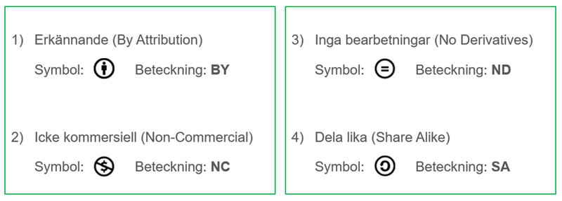 CC-licenser baseras på fyra villkor och dessa kan uttryckas antingen grafiskt med symboler eller skriftligt med förkortningar:
