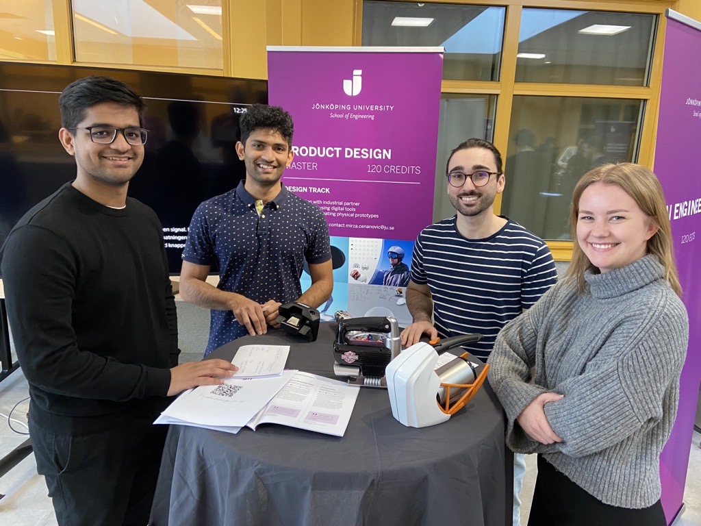 Bildtext: Magdalena Nygren som studerar byggnadsteknik på JTH är inne på att läsa även masterutbildningen Product Design på skolan. Här står hon bredvid George Eapen Arikupuram, Nishank Devaiah och Adrian Brito.