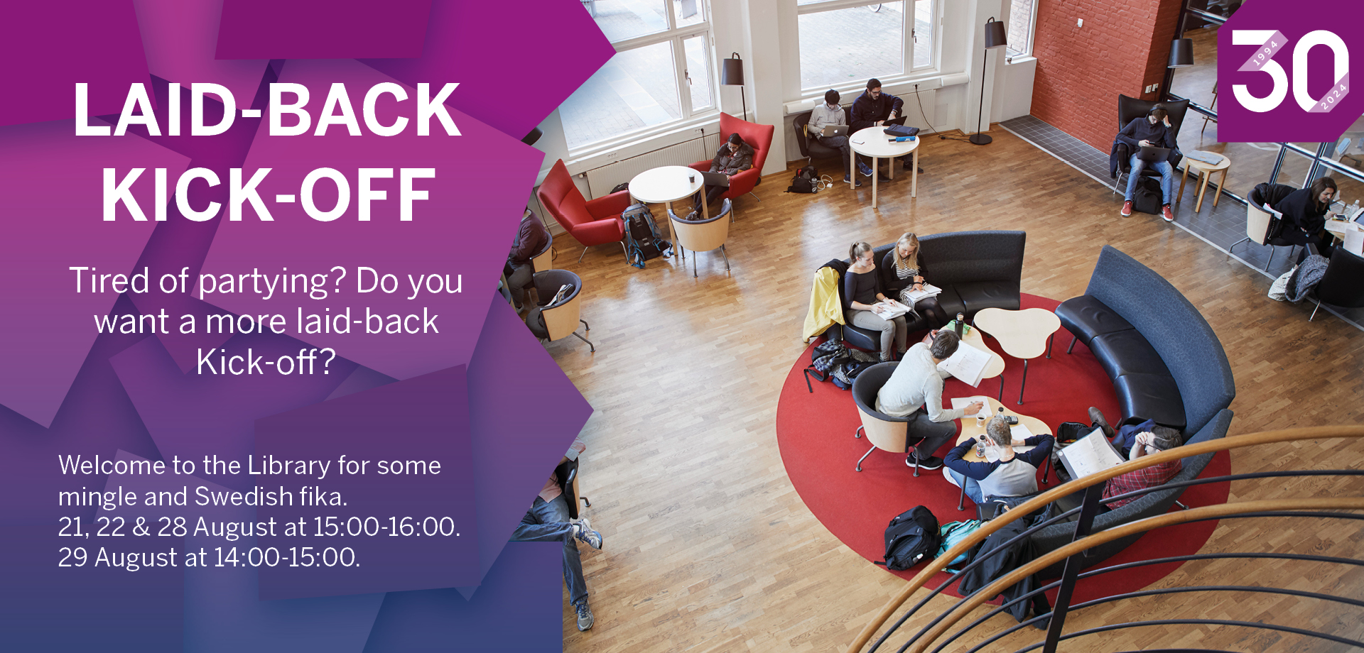 Under insparksveckorna är det mycket aktiviteter på campus och på biblioteket anordnas en lite lugnare inspark med fika och mingel. Välkommen dit 21, 22, 28 och 29 augusti!